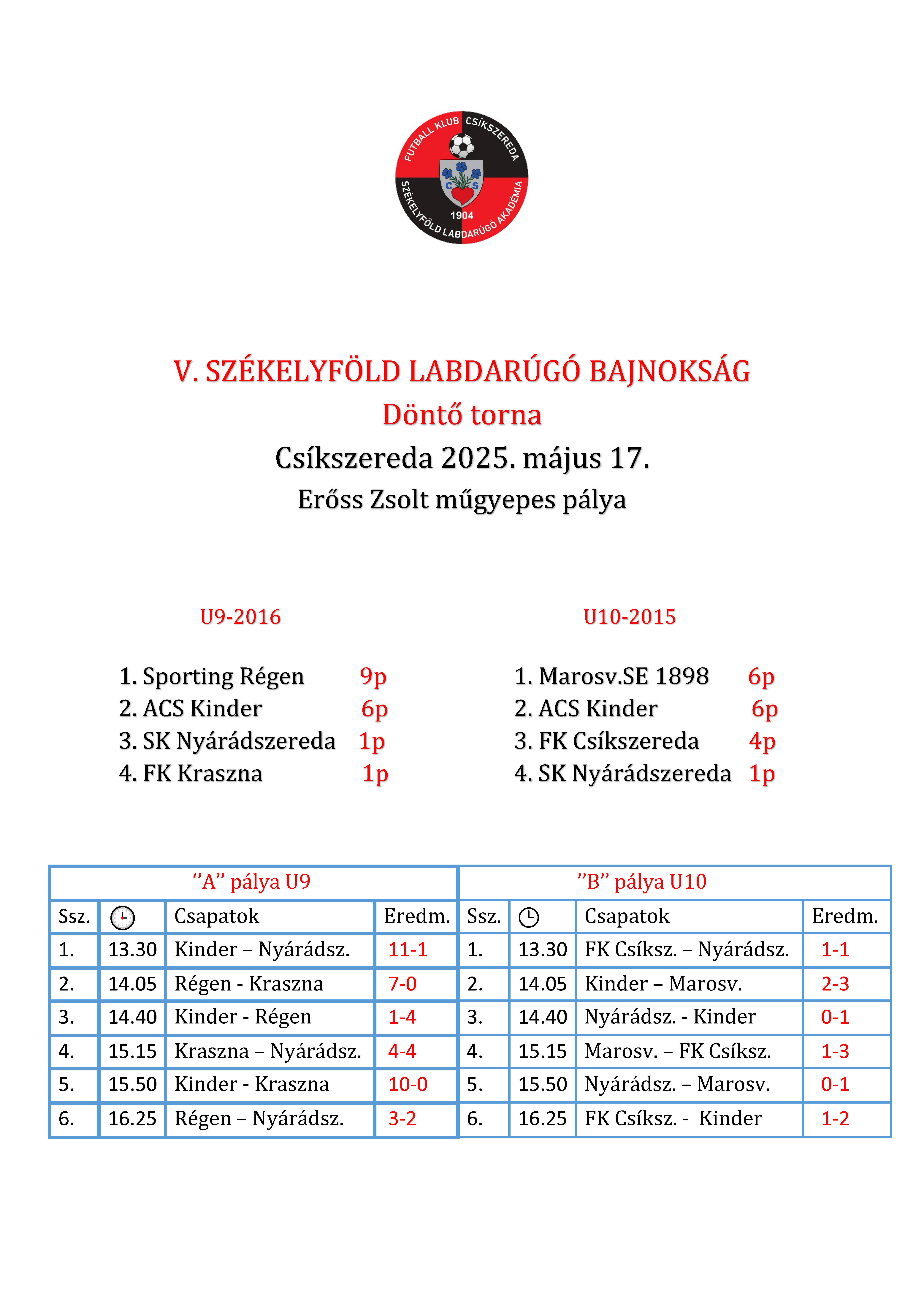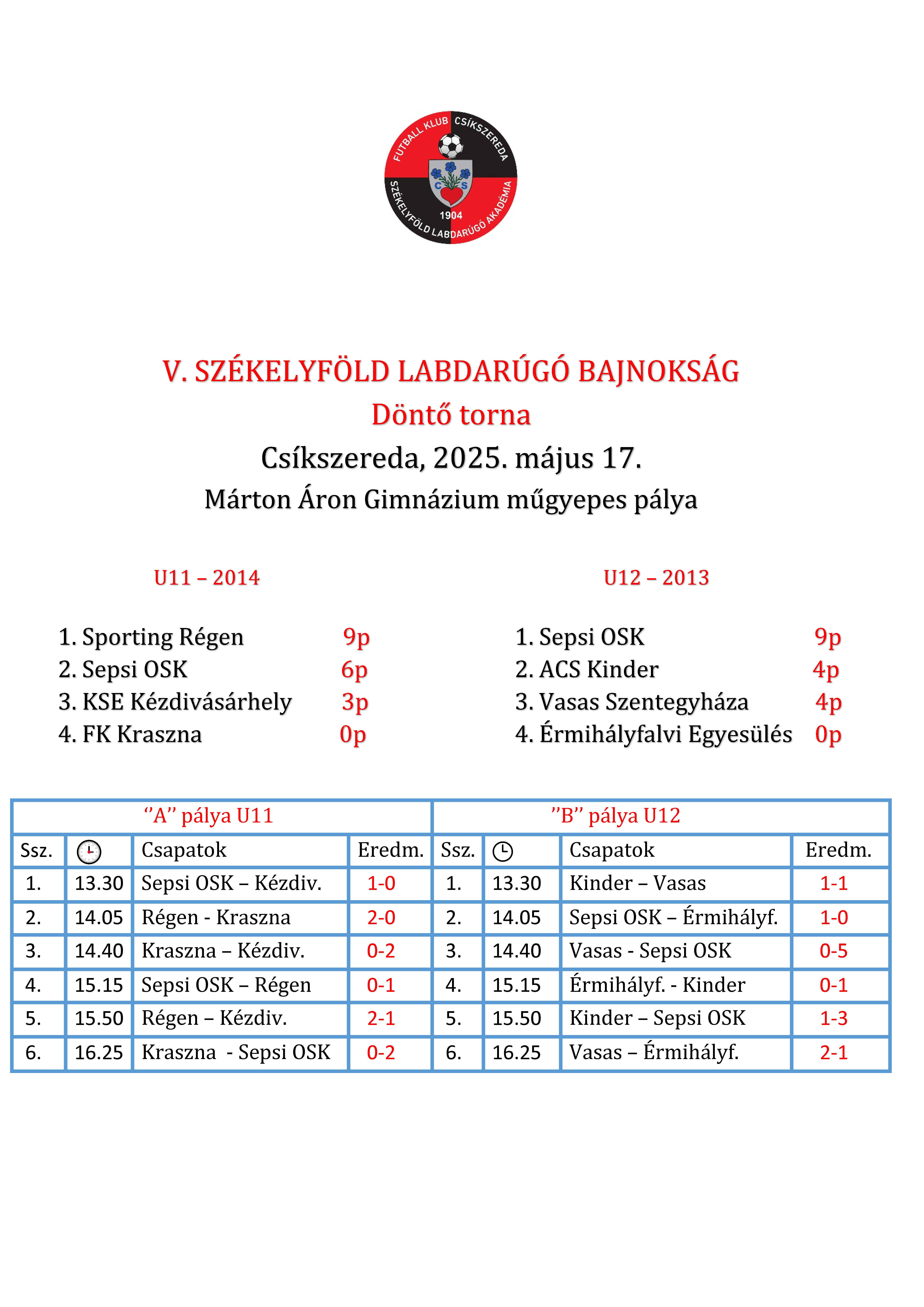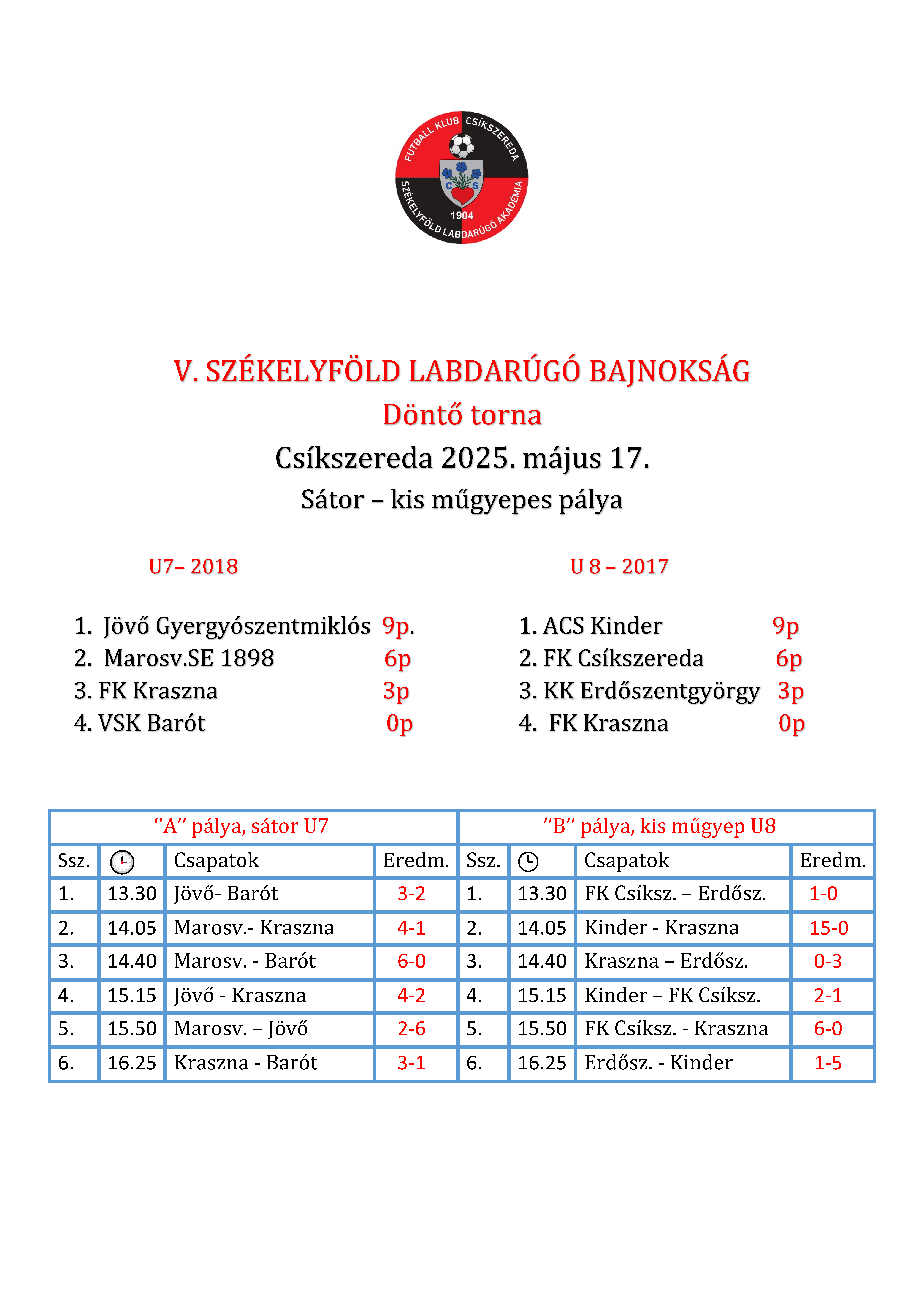 Befejeződtek az V. Székelyföld Labdarúgó Bajnokság döntőinek küzdelmei a Székelyföld Labdarúgó Akadémia szervezésében Csíkszeredában. Eredmények és helyezések.