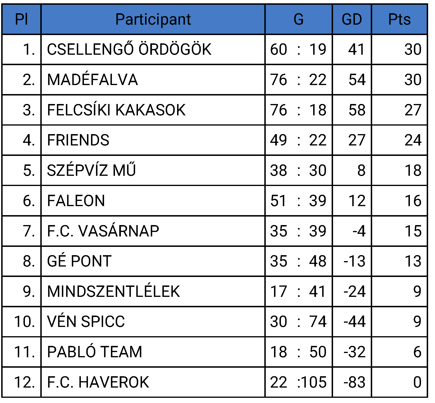 Az évfordulós torna október 1-től november 7-ig hétről hétre, fordulóról fordulóra 12 csapat kiélezett küzdelmét hozta, amelyeknek kedden és csütörtök esténként szép számmal szurkoltak a villanyfényes pálya szélén. Köszönet jár mindekinek, aki hozzájárult a torna lebonyolításához, legfőképpen Tamás László „Egér” főszervezőnek.